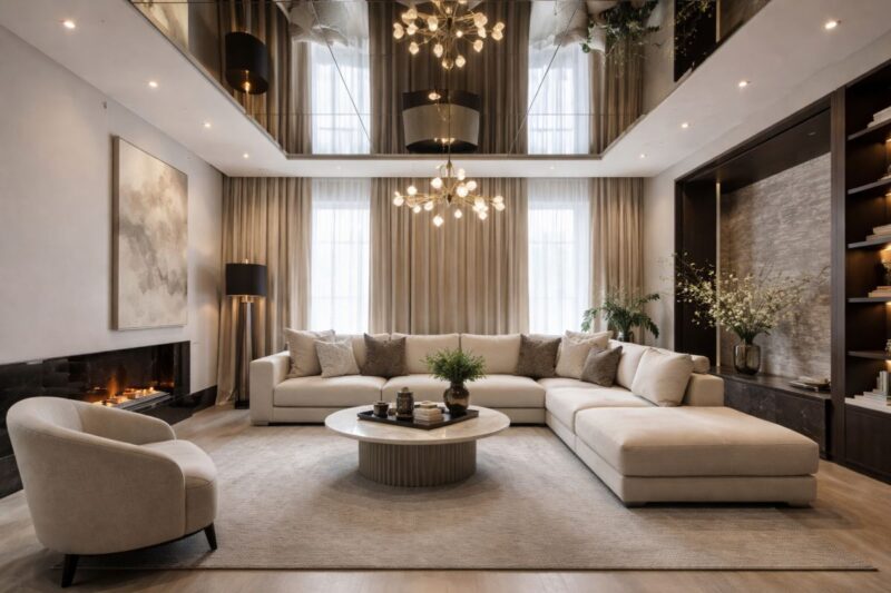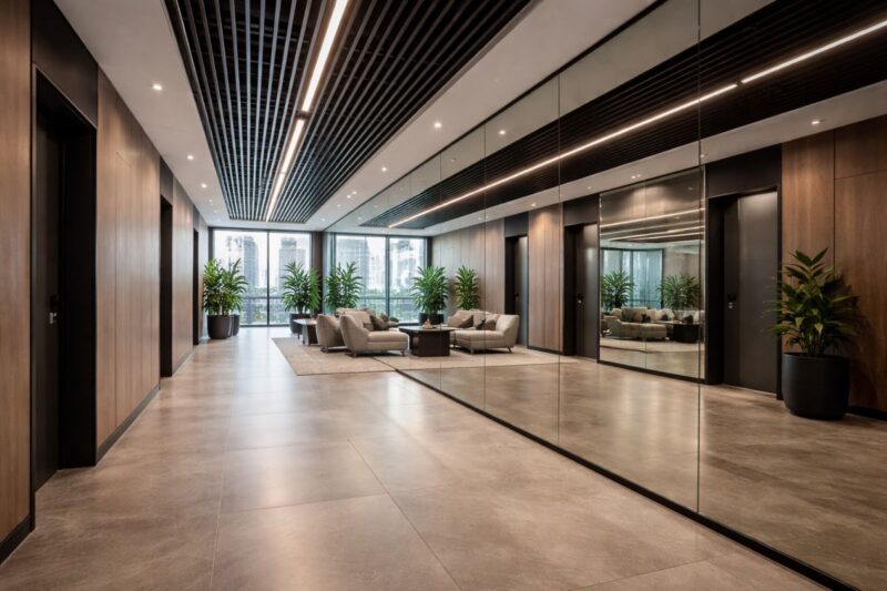 Ściany i sufity z luster optycznie powiększają wnętrza i wzmacniają efekt światła. To rozwiązanie, które wyraźnie zmienia odbiór przestrzeni.