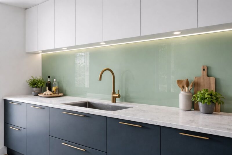 Jednokolorowe panele szklane zastępują tradycyjne materiały wykończeniowe, oferując nowoczesny wygląd i trwałość.